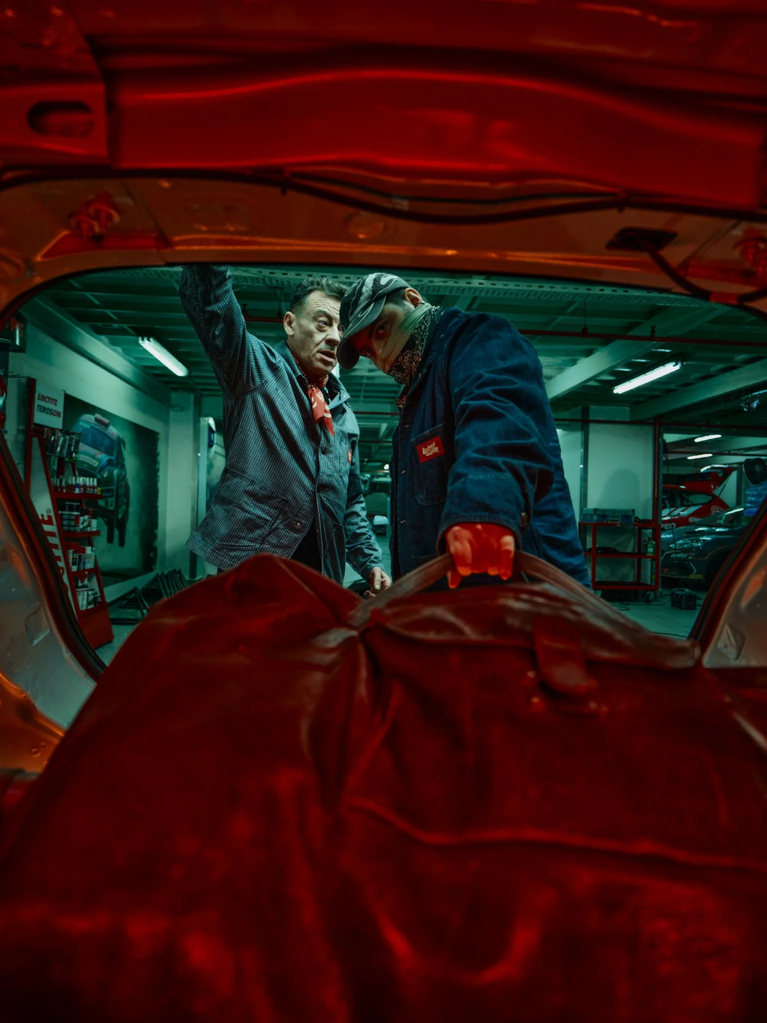 As Art Director and Photographer, I orchestrated the scene to foster authentic interaction. The lighting was designed to complement the garage's natural shadows, creating a cinematic, documentary feel. The focus was on capturing the candid discussion between the two artists.